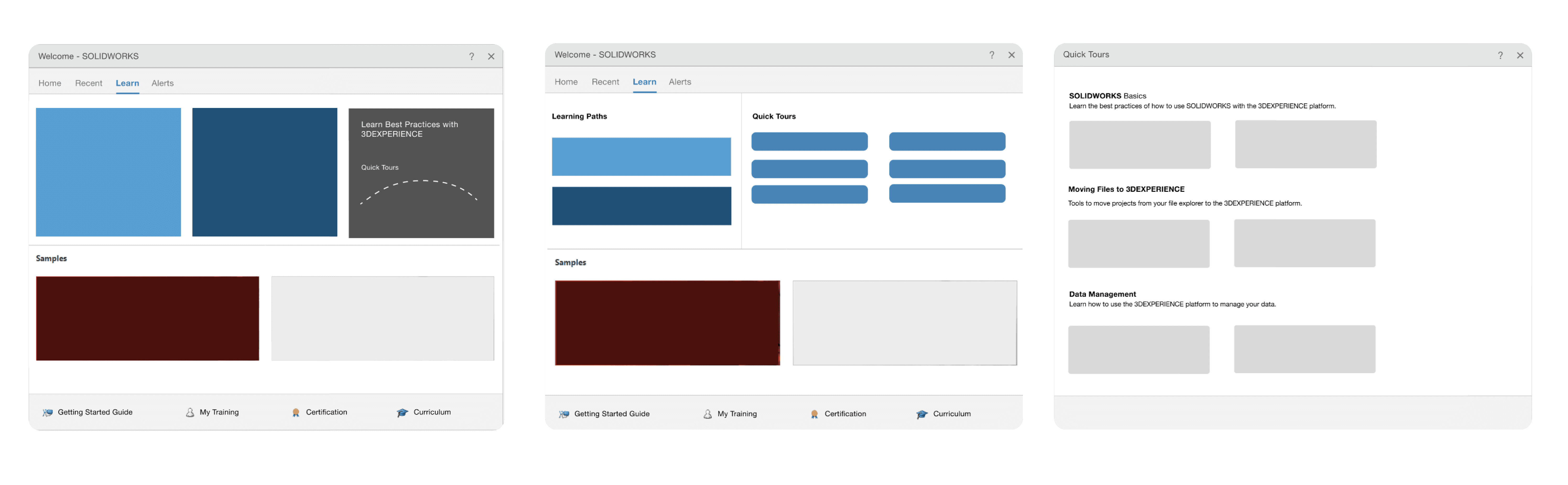I needed a hub for all of these Quick Tours to live. Most Solidworks learnings open in a separate browser window navigating the user away from Solidworks. The Quick Tours needed to be somewhere that wouldn't be distracting, but could still accessed easily by the users that needed guidance. The Welcome Dialog is a window that pops-up on open allowing users to navigate to specific tasks and files they need immediately upon entering the software. This dialog already holds a "Learn Tab" , although most of these resources need separate browser windows to access.